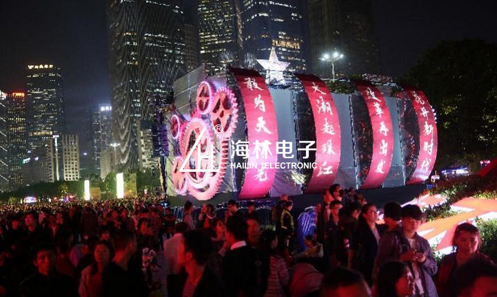 由五塊LED屏幕組成,用巨輪造型進(jìn)行銜接,寓意在改革開發(fā)40周年的環(huán)境下,廣州始終緊貼時(shí)代脈搏,在時(shí)代發(fā)展的潮流中發(fā)展,在歷史前進(jìn)的邏輯中前進(jìn),時(shí)代的力量讓羊城始終走在改革開放的浪尖,并持續(xù)綻放廣州的時(shí)代光彩。