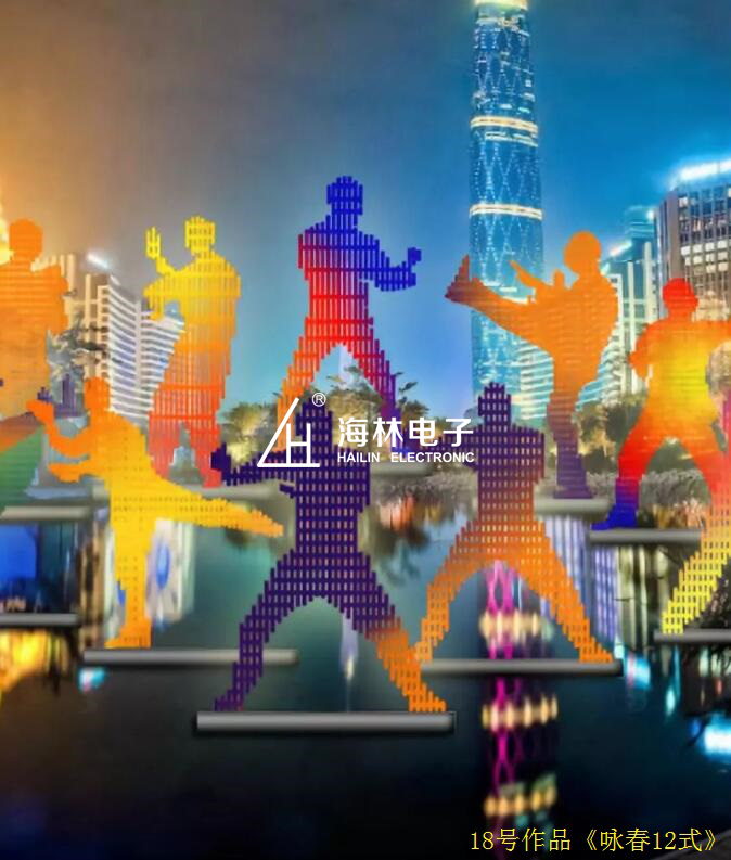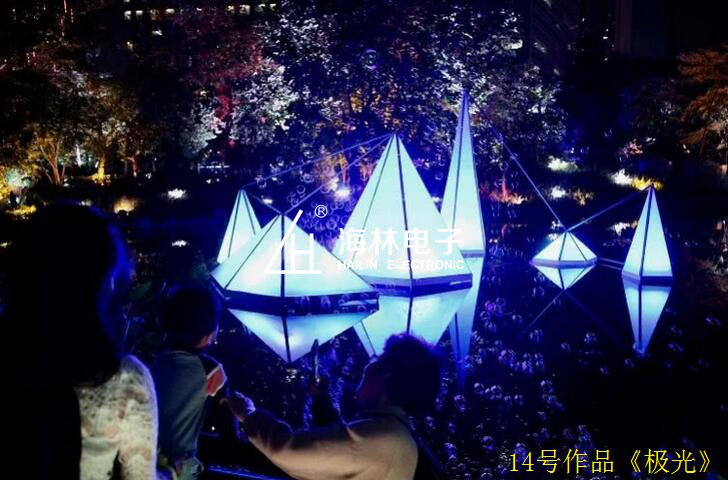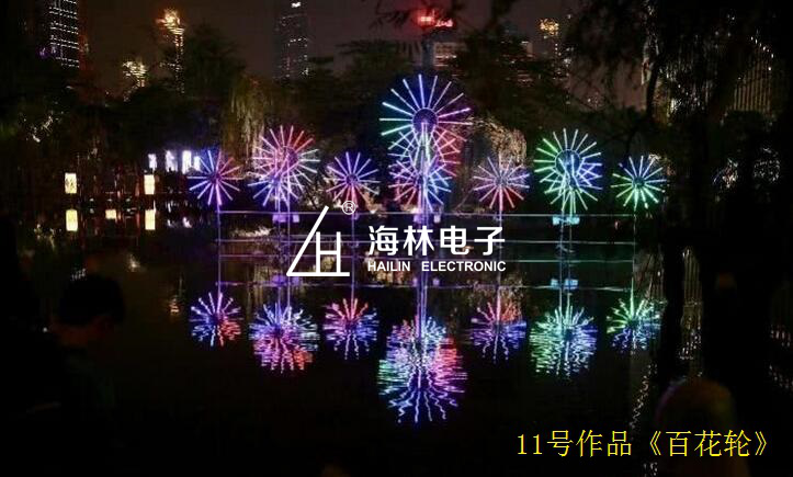 在花城廣場北區(qū)是高校組作品的集中地,共放置了8組作品:11號作品《百花輪》、12號作品《花城花開》、13號作品《懸燈結(jié)彩》、14號作品《極光》、15號作品《Firework煙花》、16號作品《暖光》、17號作品《羊城之美.心傳》以及18號作品《詠春12式》。