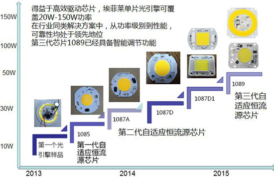 這種智能型LED恒流源徹底打破了教科書(shū)里描述的線(xiàn)性恒流源效率很低的常規(guī)認(rèn)識(shí),而破天荒地實(shí)現(xiàn)了99%的效率。從而可以實(shí)現(xiàn)把恒流源和光源放在同一塊鋁基板上,而做成光電一體化的光引擎。因?yàn)樗旧淼墓臉O低,所以把它放到光源的鋁基板上不會(huì)增加LED的結(jié)溫。深圳埃菲萊公司采用這種智能型恒流源已經(jīng)生產(chǎn)了一系列不同功率的光引擎: