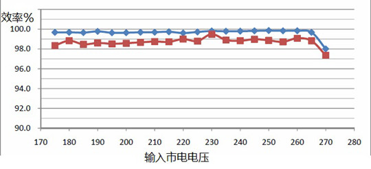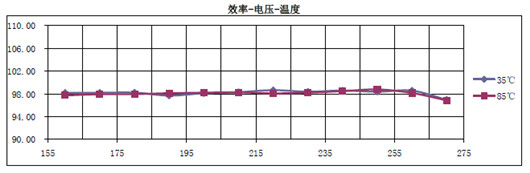 由圖中可以看到,當(dāng)環(huán)境溫度從35度升高到85度時(shí),整個(gè)效率隨輸入電壓變化曲線(xiàn)幾乎完全一樣,始終保持在98%以上(包括了整流器的效率在內(nèi))。