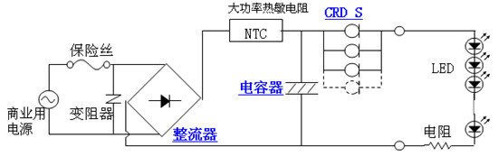 圖中的CRD就是恒流二極管,圖上采用了幾個(gè)CRD并聯(lián),以得到所需的恒流值,實(shí)際上現(xiàn)在有很多不同恒流值的恒流二極管可供選用,所以也不需要采用并聯(lián)的方法來(lái)得到所需的恒流值了。所以只要采用一個(gè)恒流值相當(dāng)?shù)暮懔鞫O管和所有LED相串聯(lián)就可以實(shí)現(xiàn)對(duì)LED的恒流供電,可見(jiàn)它的電路是十分簡(jiǎn)單的!
