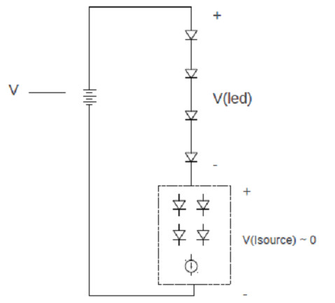 其中方塊中的這部分LED就是可以自適應(yīng)地接入到主串LED中,也可以從主串中自適應(yīng)地?cái)嚅_(kāi)。接入或斷開(kāi)的個(gè)數(shù)由輸入電壓變化的大小而決定。它能感知輸入電壓的變化,并由此來(lái)決定LED數(shù)目的變化,所以它是自適應(yīng)的,也可以說(shuō)是智能的。